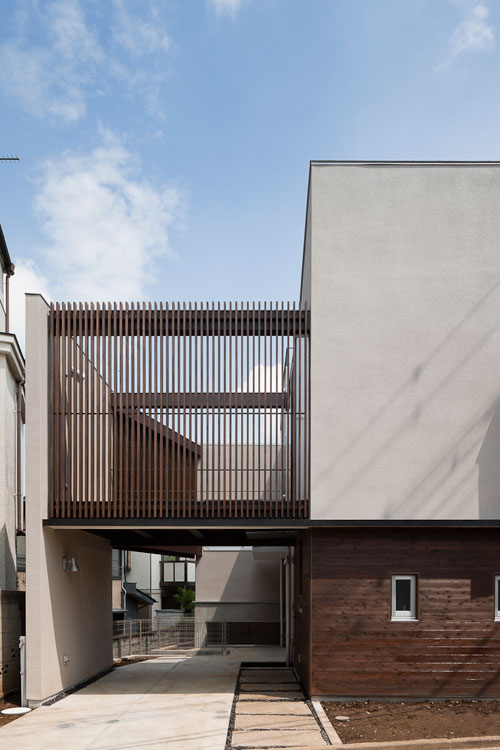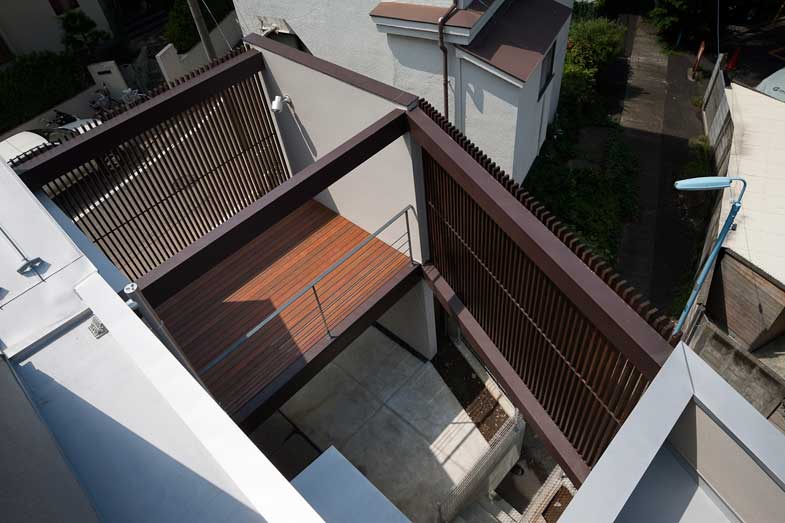 地下には主寝室・書斎・納戸が、地上には木製ルーバーで囲われたコート2カ所を通して敷地の端から端まで見通せます。浴室・LDK・子供スペースが中庭コートに面し、スキップフロアでつながり、最上部の吹き抜けに面したワークスペースのタラップから屋上のデッキに上がると、春には隣地越しに桜並木が眺められるよう計画しています。
